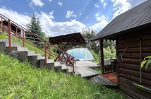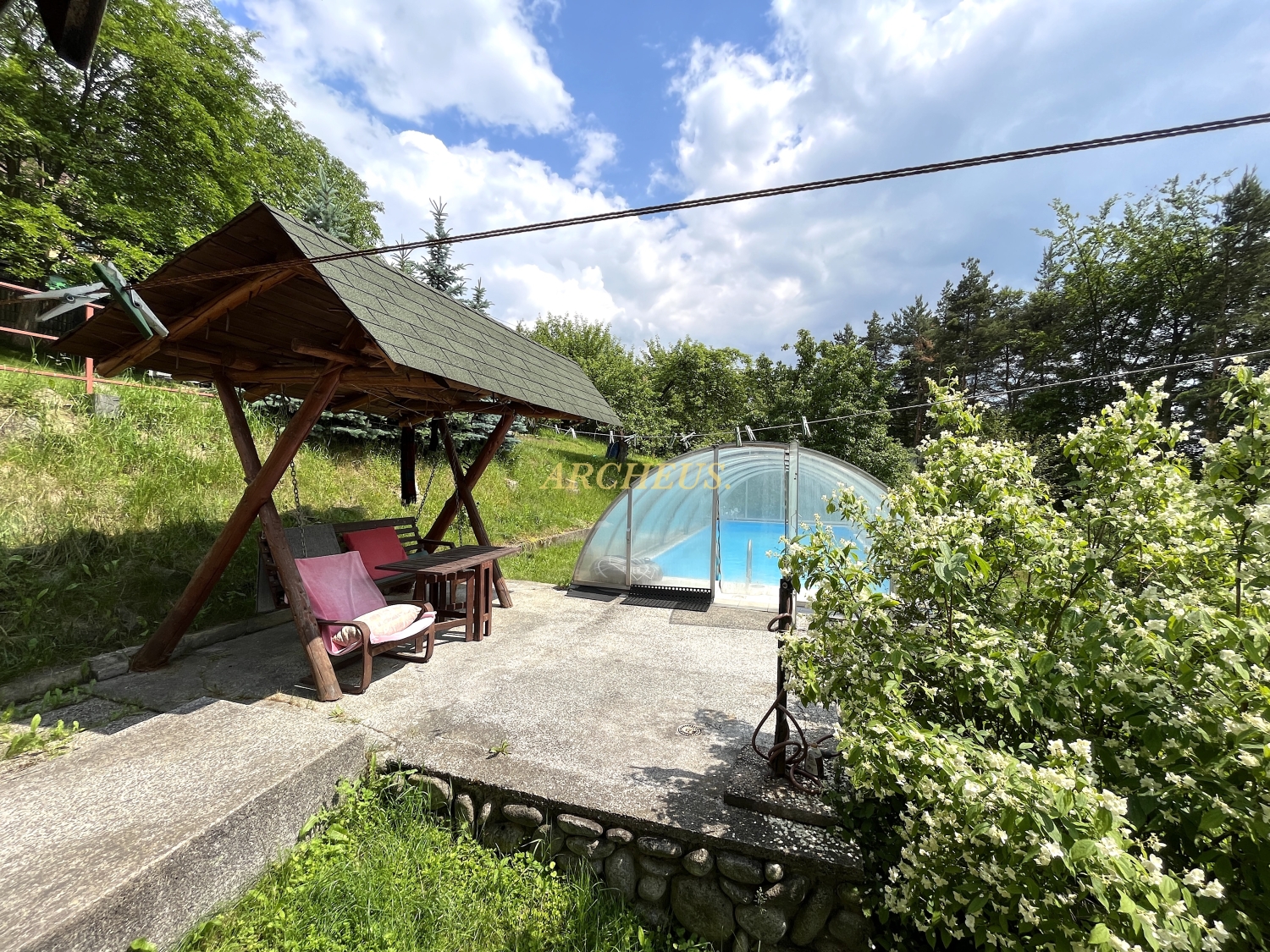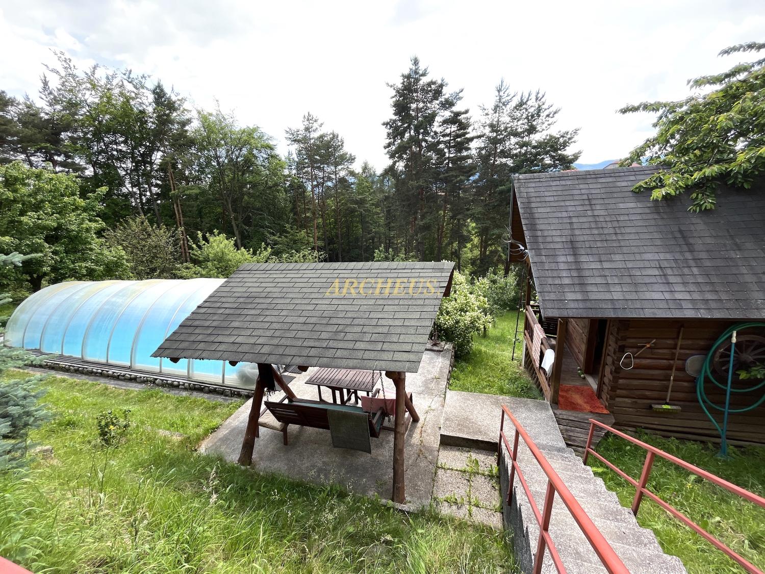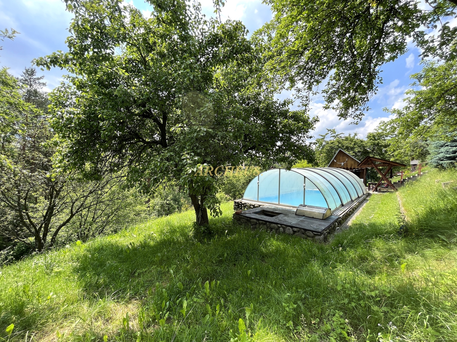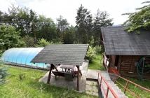 Na pozemku sa nachádza bazén s protiprúdom a drevená záhradná chatka.