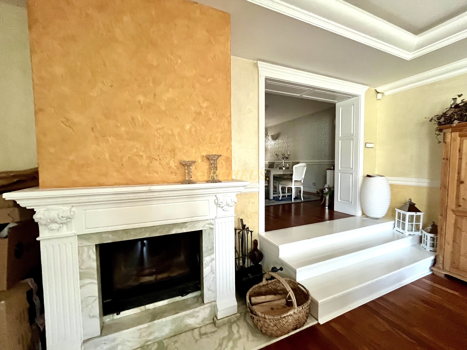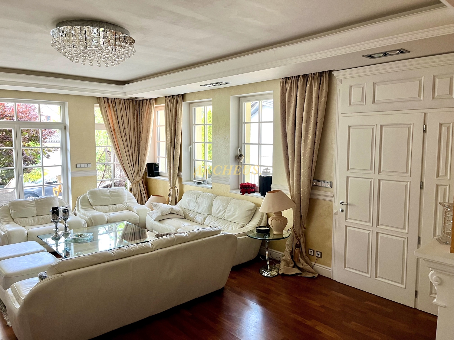 Podlahy: Luxusné drevené podlahy v obytných miestnostiach a elegantná keramická dlažba inde.