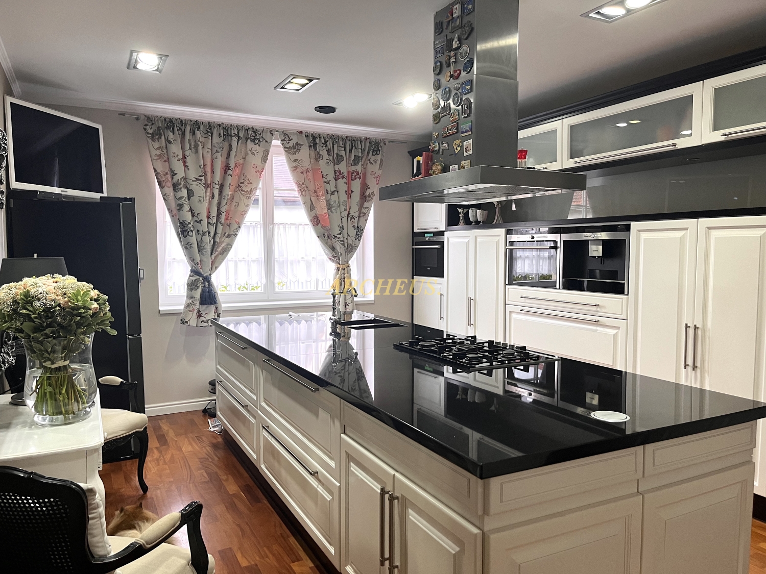 Srdcom domu je na mieru robená kuchynská linka z prírodného dreva s elegantnou kamennou pracovnou doskou. Kuchyňa je plne vybavená špičkovými zabudovanými spotrebičmi: