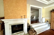 Impozantná obývacia hala s krbom, priamym vstupom na terasu a jedálňou.