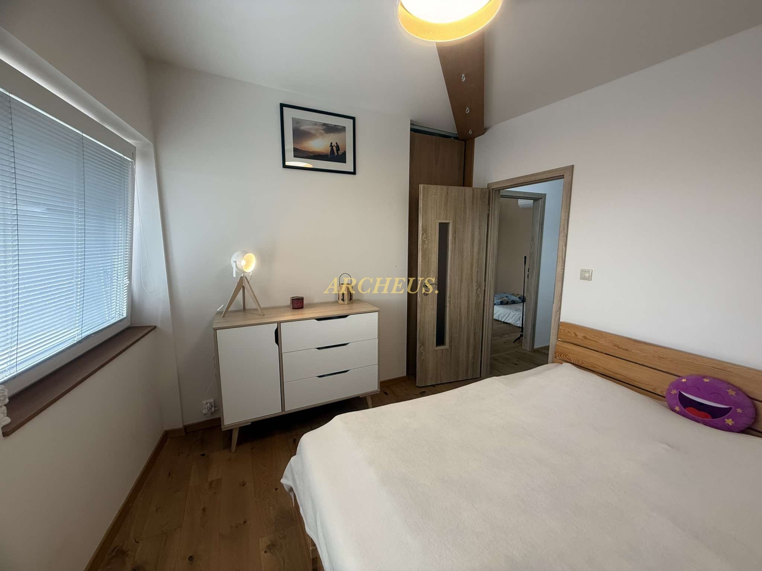- schodiskom sa dostaneme na hornú časť mezanínu, kde sa nachádza chodba s úložným priestorom, vstup do spoločnej technickej miestnosti, kúpeľňa s vaňou, umývadlo a toaleta. Okrem toho sa na poschodí nachádzajú dve izby - spálňa a detská izba.