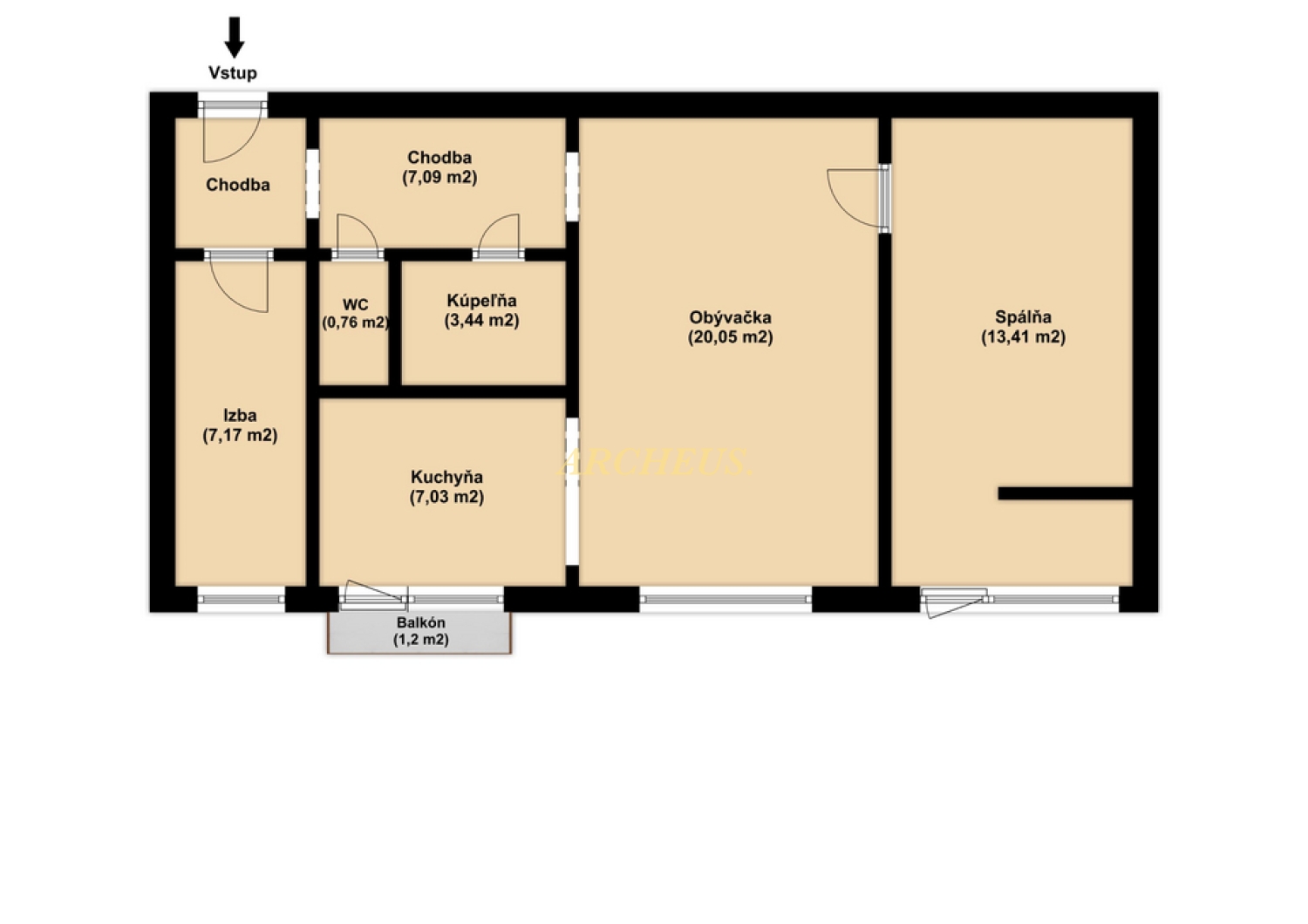 dispozične: obývacia izba (20,5 m²), spálňa (13,41 m²), izba (7,17 m²), kuchyňa (7,03 m²), chodba (7,09 m²), kúpeľňa (3,44 m²), samostatné WC (0,76 m²)