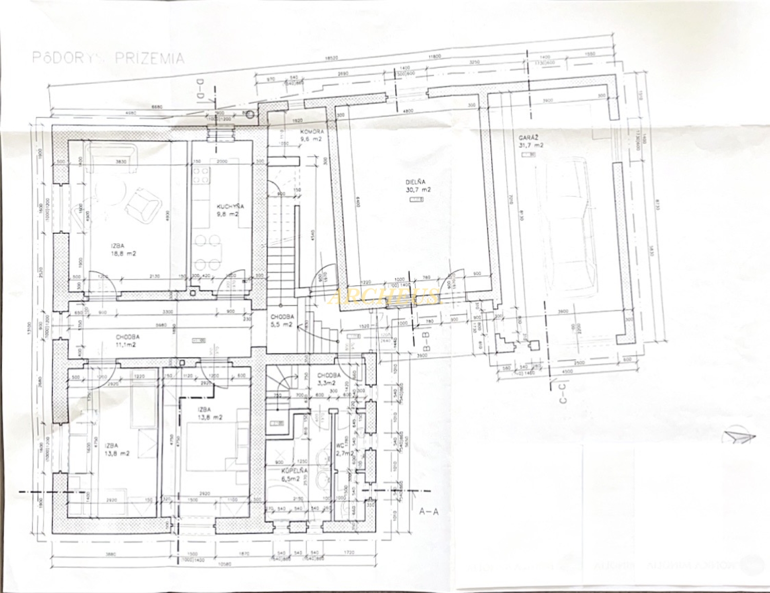 - prízemie: vstupná chodba, chodba, kuchyňa spojená s obývacou izbou, 2 izby, kotolňa, WC, kúpelňa, komora
