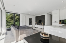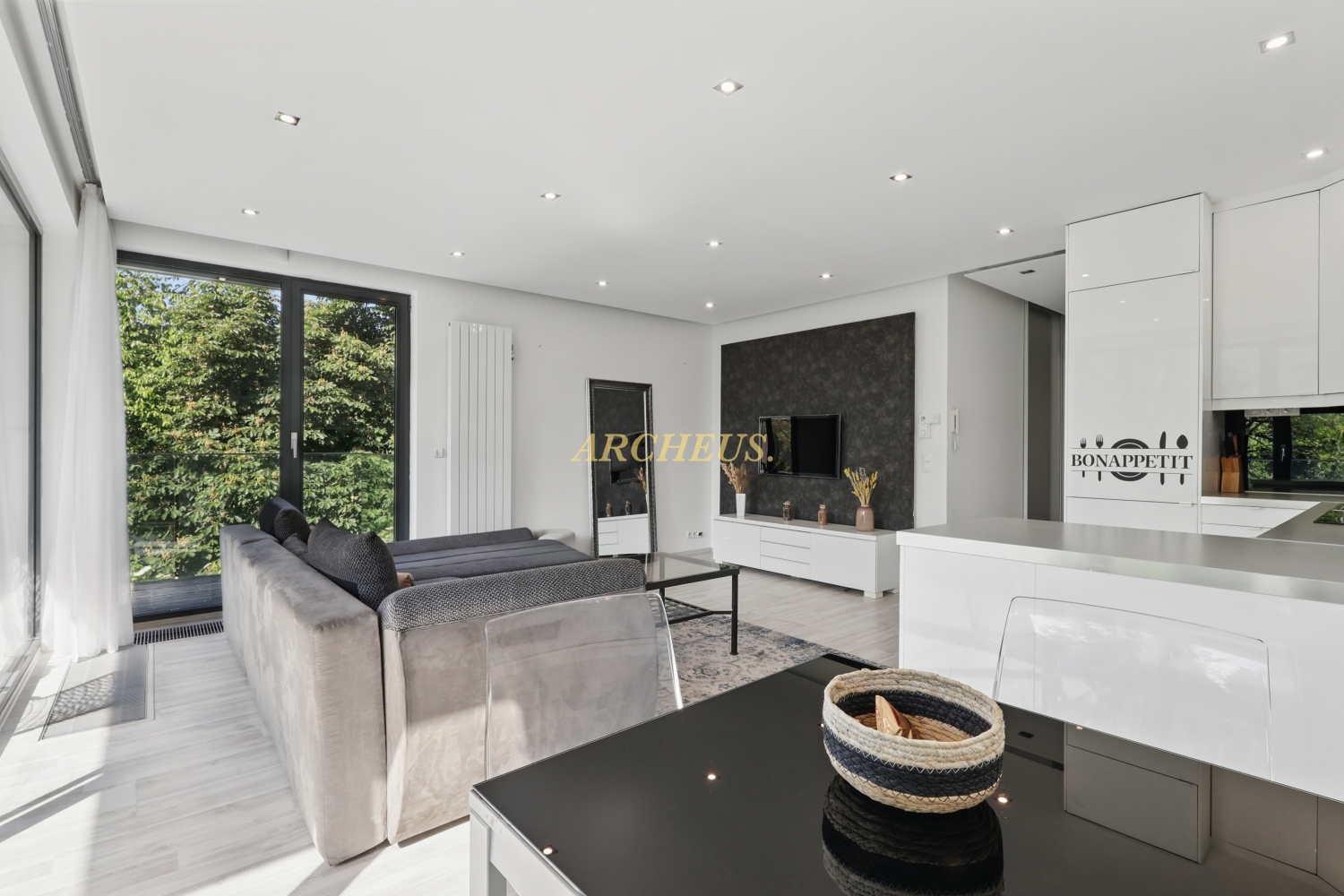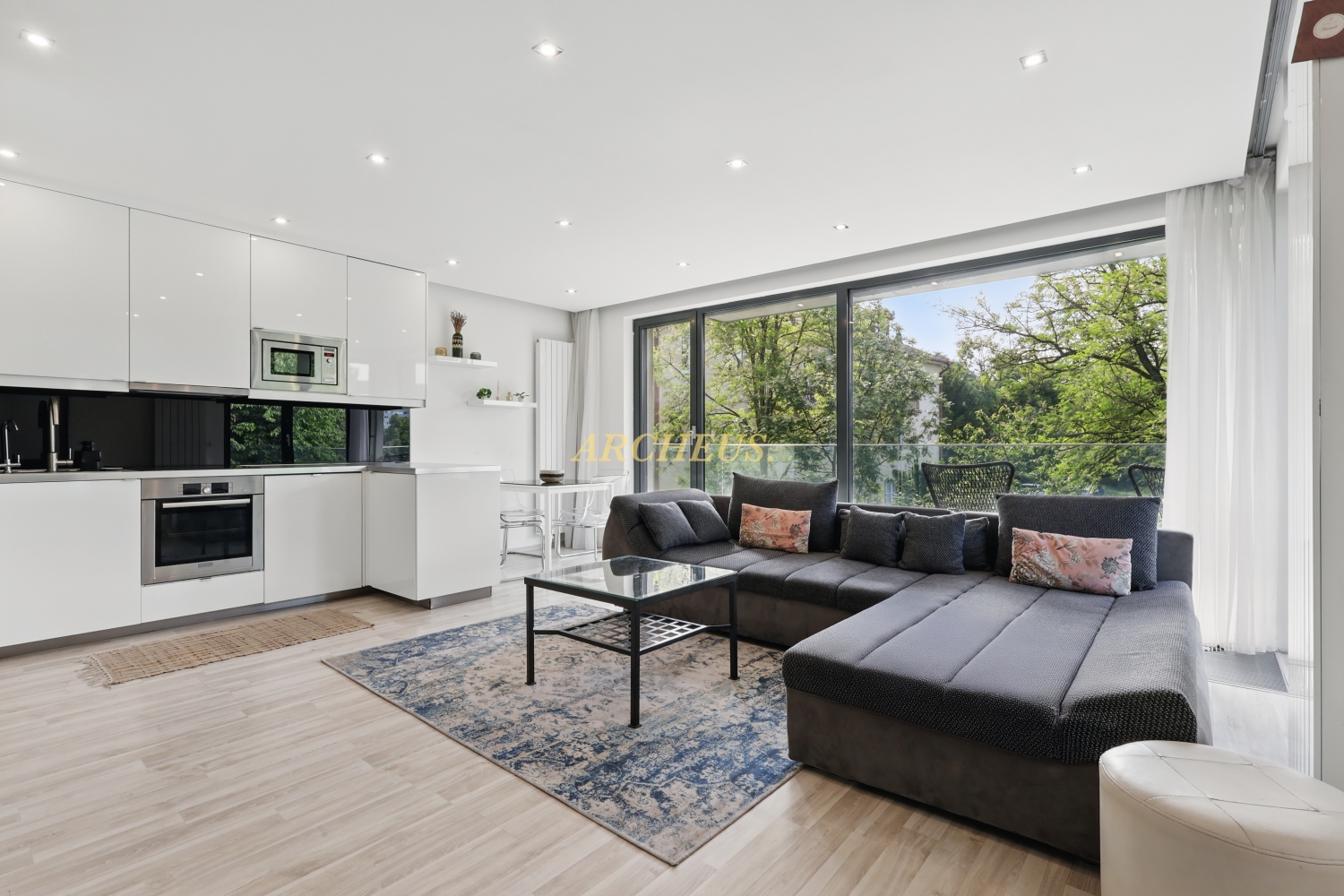 Svetlá obývačka s kuchyňou – otvorený priestor s nádherným výhľadom do zelene