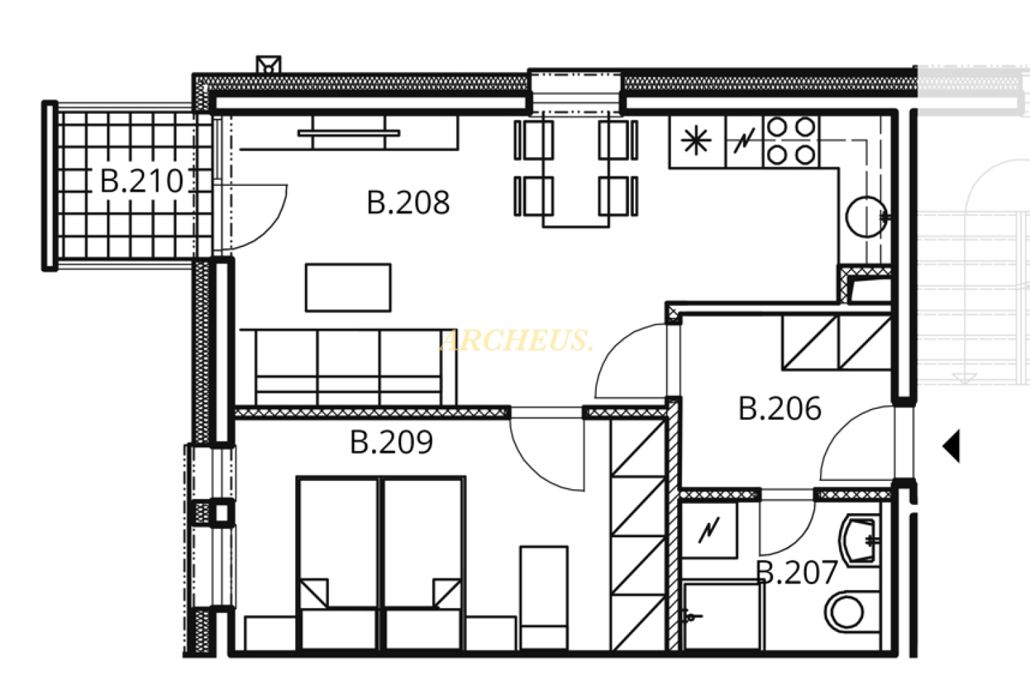 Byt pozostáva z: predsiene, obývacej izby spojenej s kuchyňou, dvoch spální, kúpeľne, WC, loggie a kobky na poschodí bytu