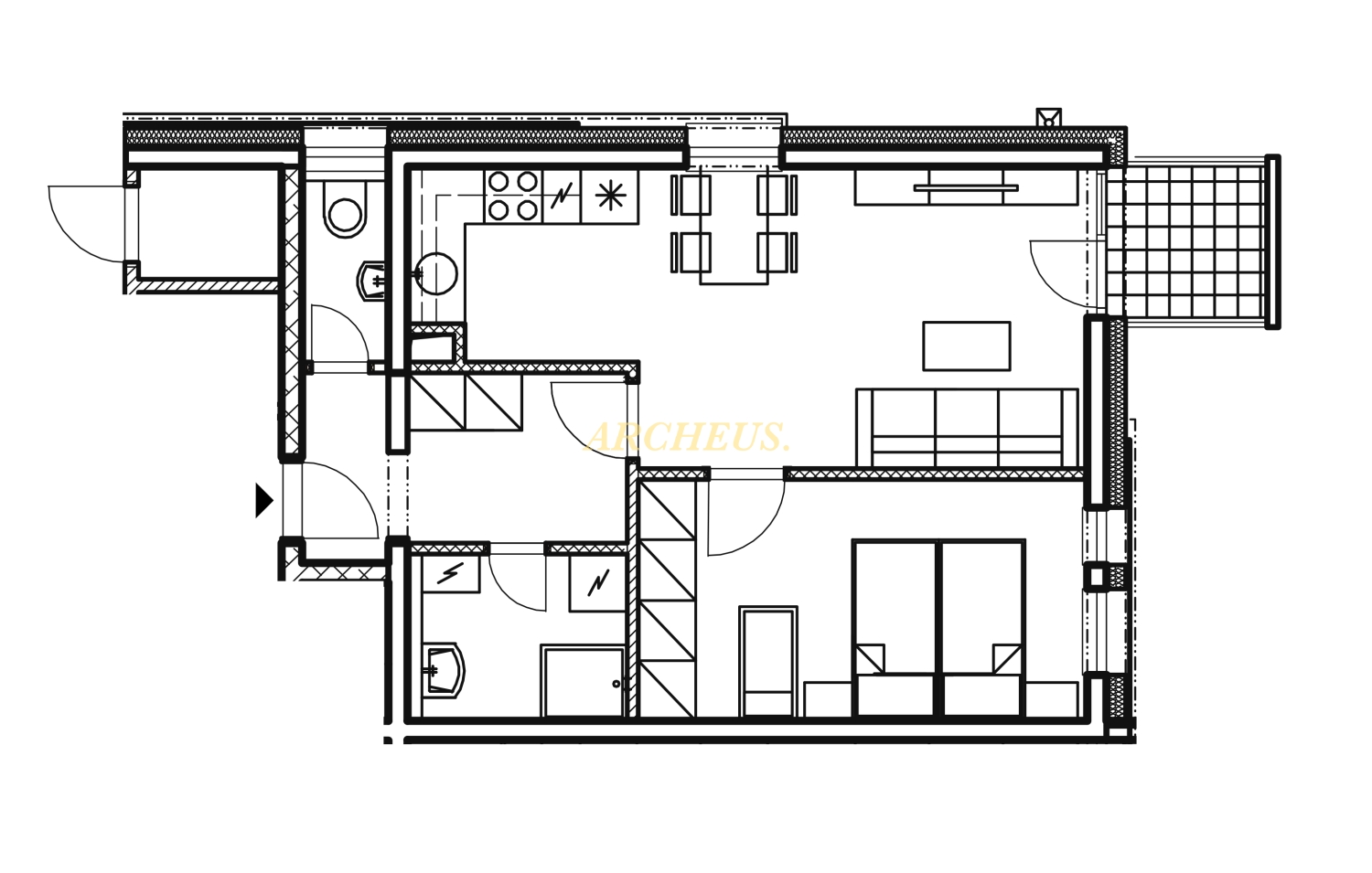 Byt pozostáva z: predsiene, obývacej izby spojenej s kuchyňou, spálne, kúpeľne, WC, balkóna a kobky na poschodí bytu