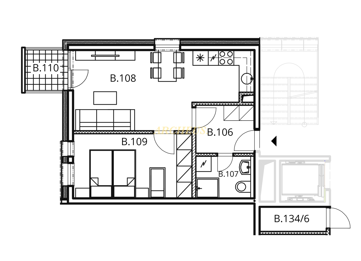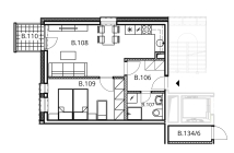 Byt pozostáva z: predsiene, obývacej izby spojenej s kuchyňou, spálne, kúpeľne s WC, balkóna a kobky na poschodí bytu