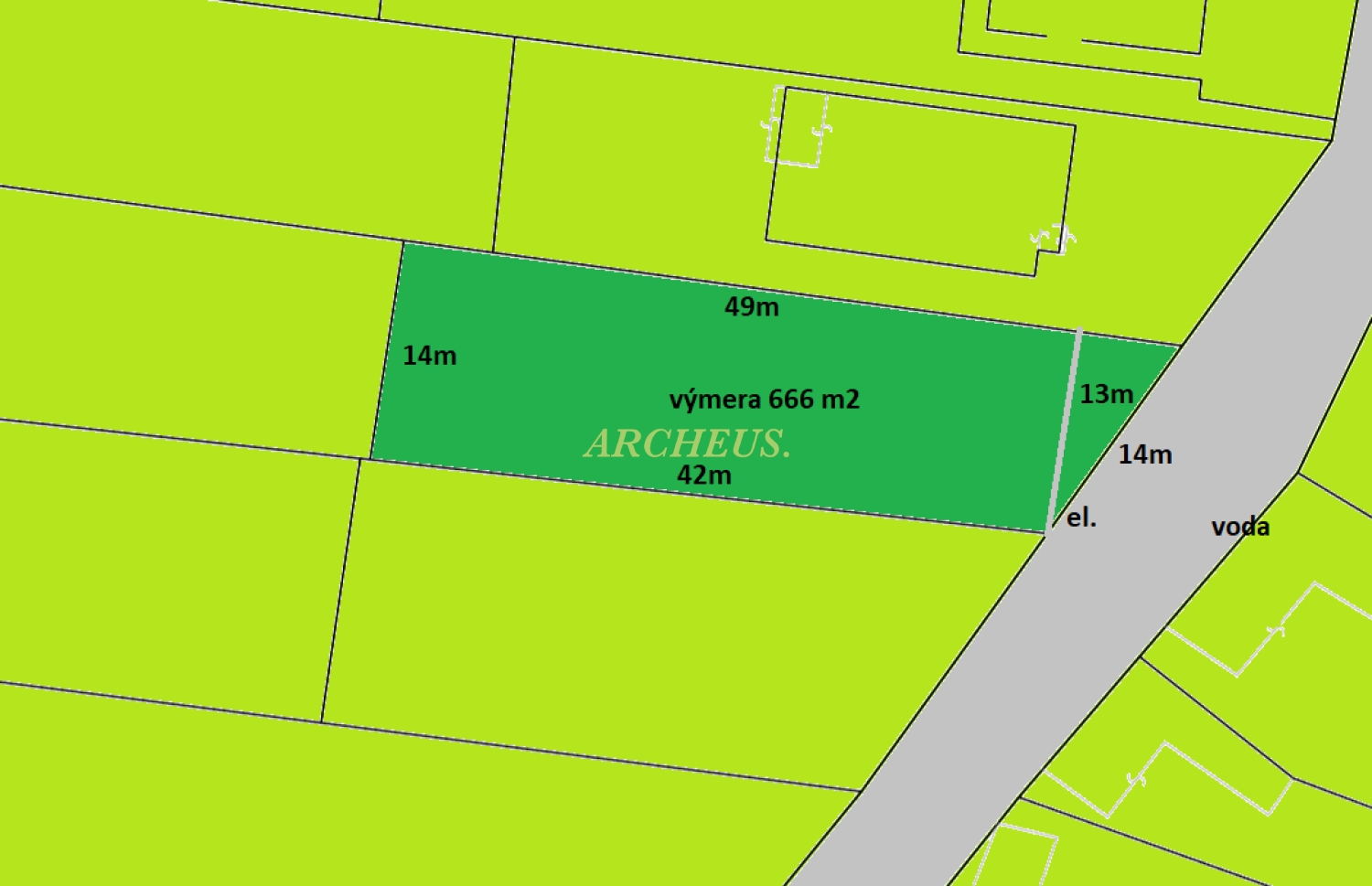 Pozemok má výmeru 666 m² a jeho presné rozmery sú uvedené v pôdoryse.