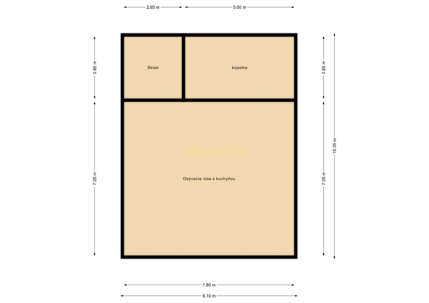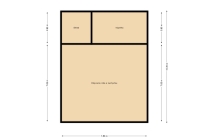 Na prízemí sa nachádza priestranná obývacia miestnosť spojená s kuchyňou, kúpeľňa a menšia izba.