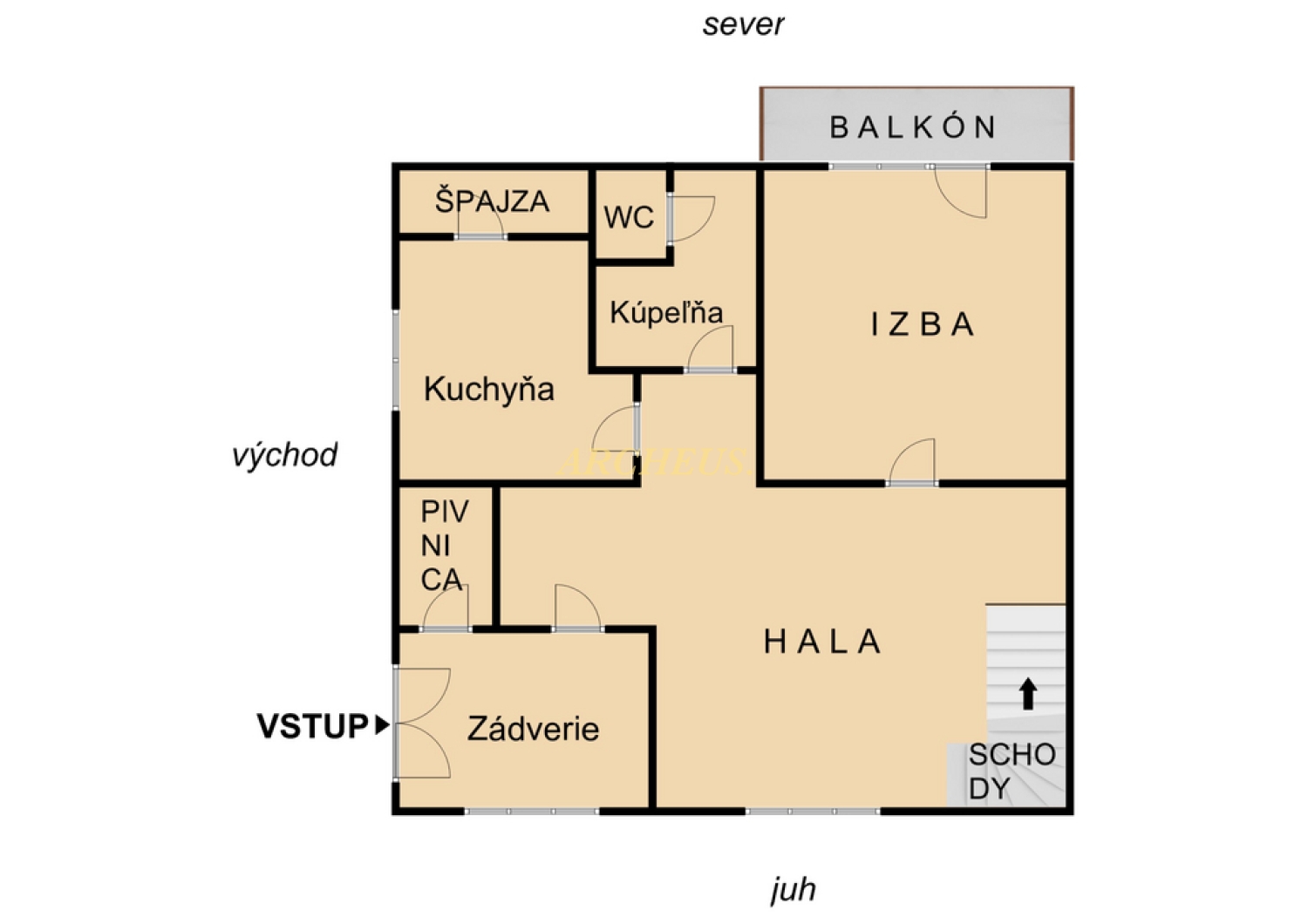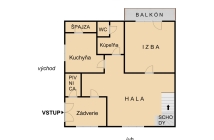 - obytnú časť tvorí: prvé nadzemné podlažie - zádverie, hala, kuchyňa, špajza, kúpeľňa, WC a izba s balkónom