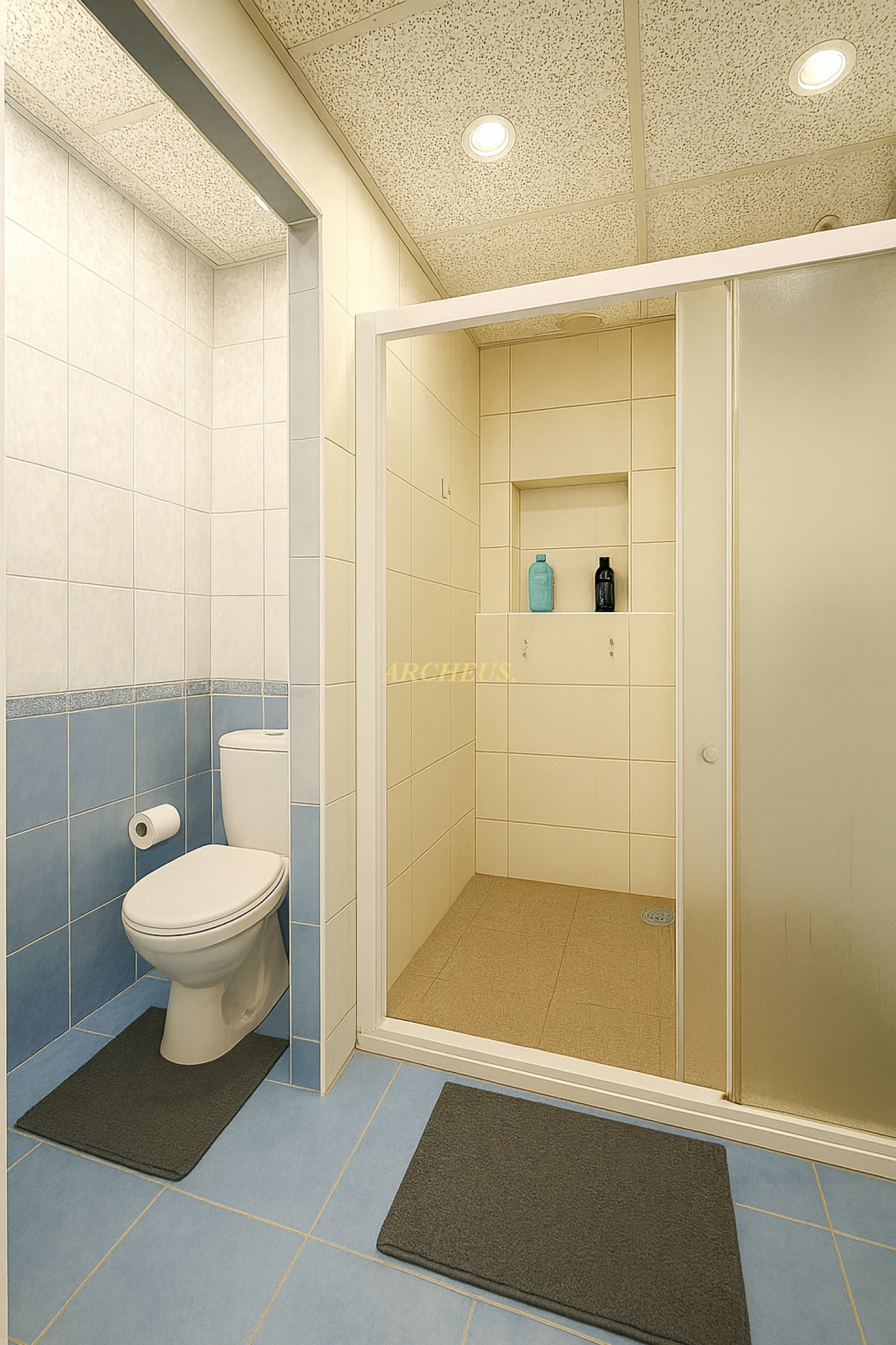 murovaná kúpeľňa so sprchovým kútom, umývadlom a WC