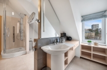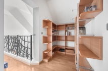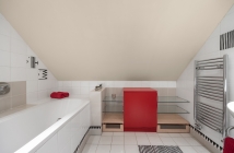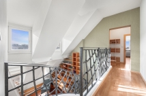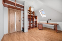 Štýlové drevené schodisko s kovaným zábradlím Vás zavedie do súkromnej zóny. Dominuje jej master bedroom s vlastným veľkým šatníkom a veľkolepou podkrovnou kúpeľňou s vaňou aj sprchovým kútom. Dispozíciu dopĺňa tichá pracovňa, izba a samostatné WC.