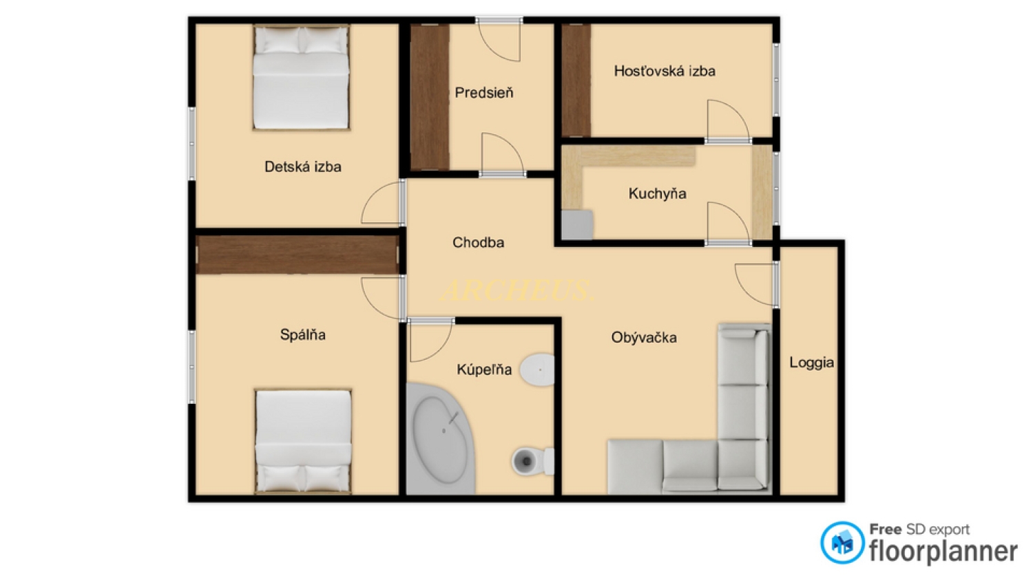 - pozostáva z predsiene so vstavanou skriňou a samostatnej chodby, kúpeľne – vaňa s WC, priestranná kuchyňa, obývačka s loggiou, detská a hosťovská izba, spálňa