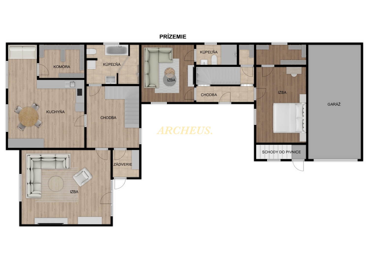 Nehnuteľnosť je vďaka svojej dispozícii ideálnym riešením pre viacgeneračné bývanie alebo kombináciu rodinného života s podnikaním.