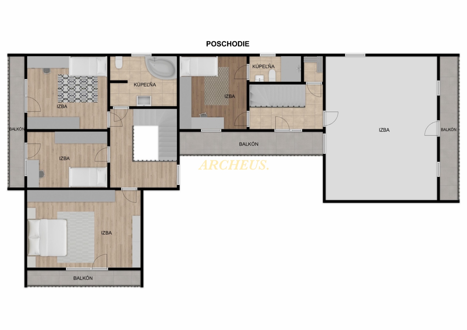 Obytné podkrovie: Pozostáva z troch samostatných izieb, pričom z každej izby je prístup na balkón. Dispozíciu podlažia dopĺňa druhá veľkorysá kúpeľňa.