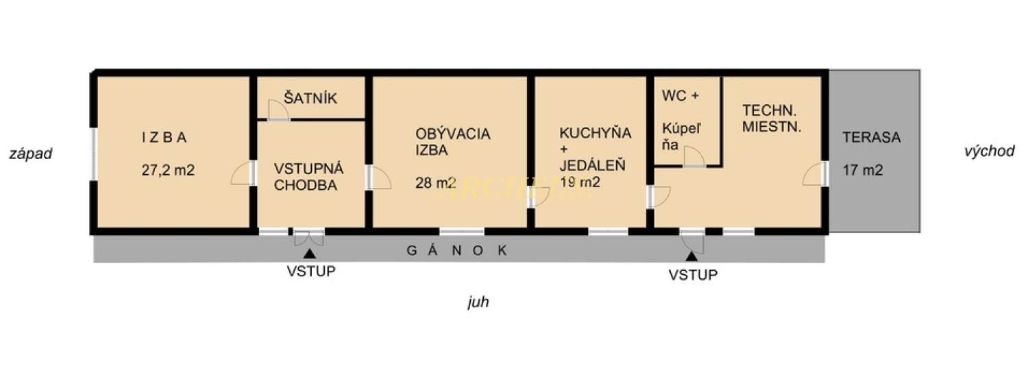 - pozostáva zo: vstupnej chodby, prednej izby, šatníka, obývacej izby, kuchyne s jedálňou, WC s kúpeľňou a technickej miestnosti