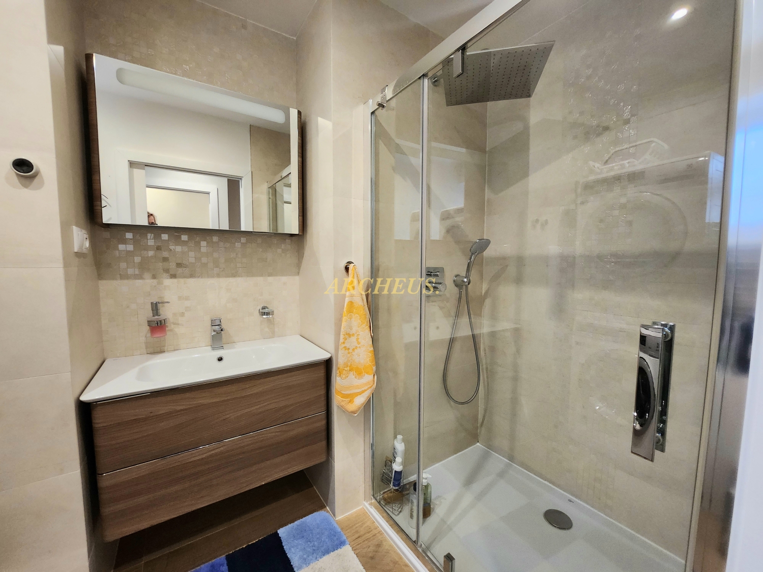 🚿kúpeľňa so sprchovacím kútom vybavená pračkou a sušičkou