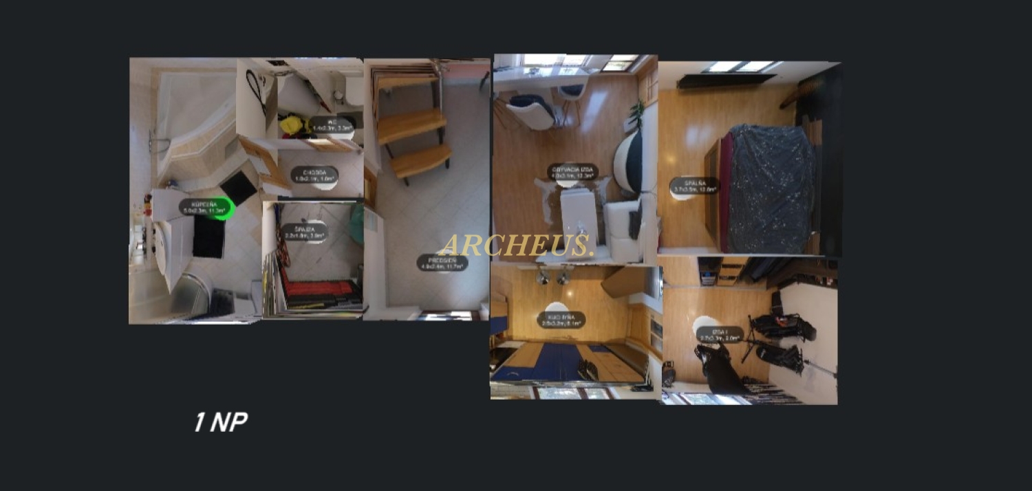 - Prízemie (1. NP): predsieň, chodba, komora, obývacia izba, 2 izby, kuchyňa, kúpeľňa, samostatné WC