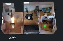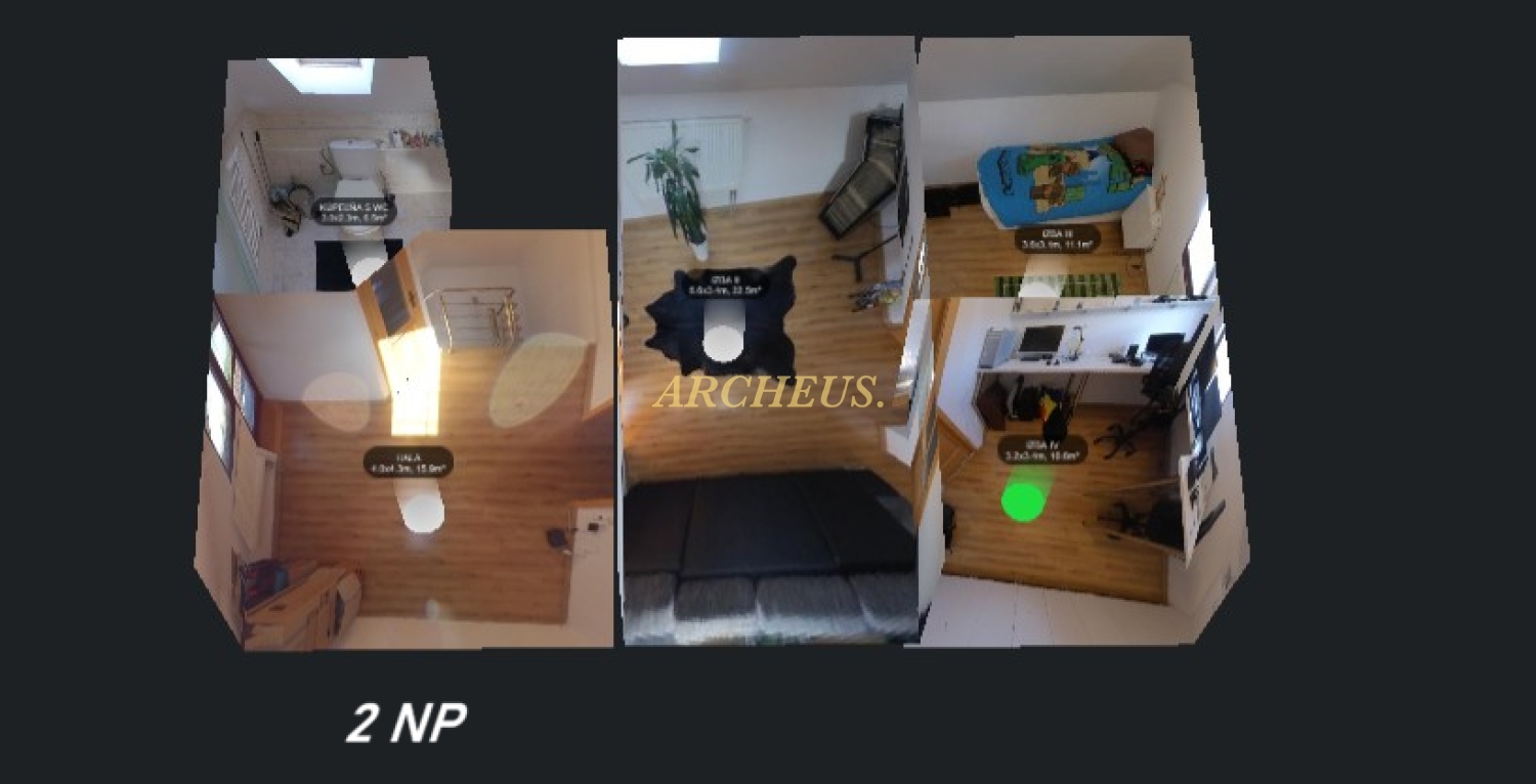 - Poschodie (2. NP): hala, 3 izby, kúpeľňa s WC, balkón