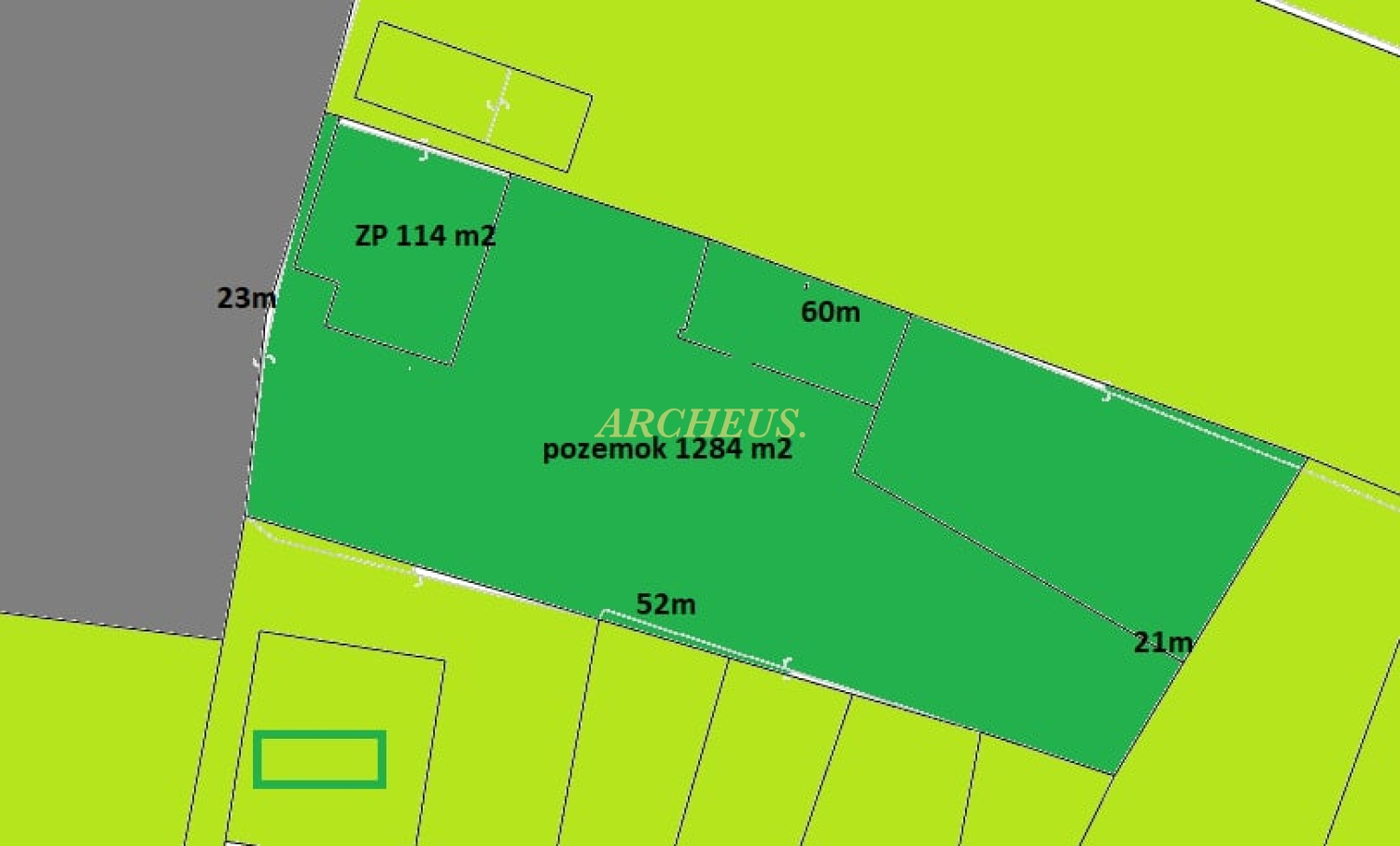 Nehnuteľnosť sa nachádza na rovinatom pozemku o výmere 1 284 m² so šírkou 23m.