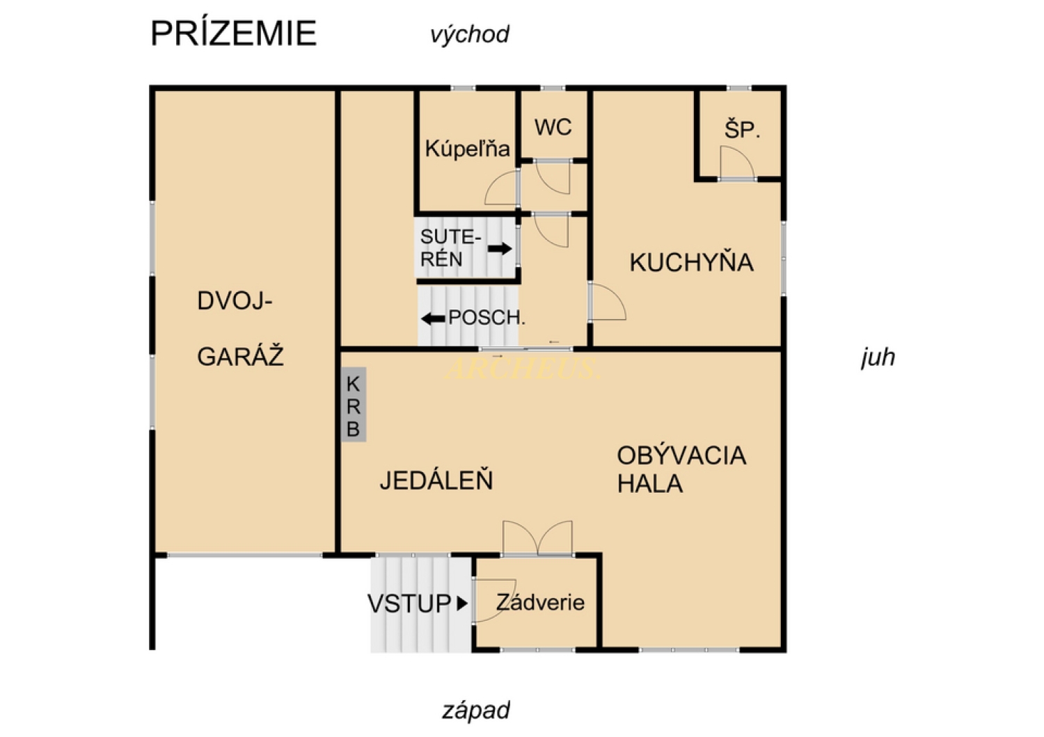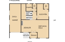 - na prízemí máme: obývaciu halu s jedálňou, kuchyňu + špajz, kúpeľňa a WC