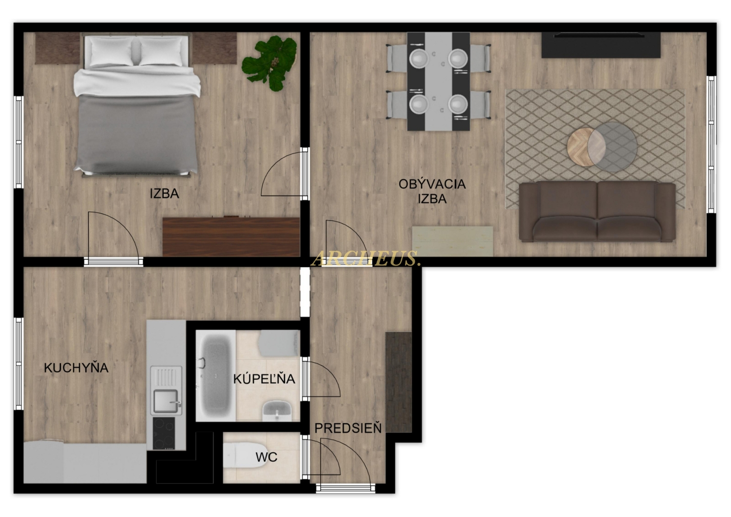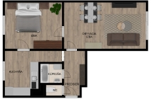 Byt ponúka praktickú dispozíciu, ktorej hlavnou prednosťou sú priestranné izby.